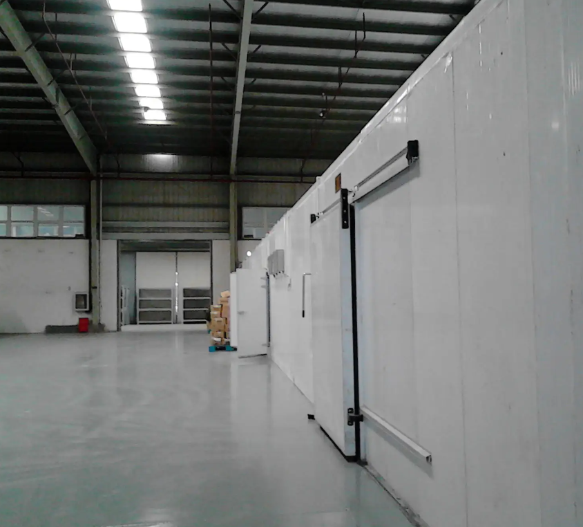 1、庫房部分:該食品冷庫安裝聚氨酯雙面彩鋼板,選用的是100mm厚聚氨酯保溫,雙面彩鋼0.426mm厚,并有B2級阻燃的特點(diǎn)。庫內(nèi)安裝的手動(dòng)平移門為雙面彩鋼板,雙面彩鋼0.426mm厚,門洞尺寸: 1500mm*2000mm*100mm厚。庫內(nèi)的地面還鋪有XPS擠塑板保溫層;還鋪有地面PE防水防潮膜(厚度不小于0.2mm,上下兩層)。庫內(nèi)安裝定制的風(fēng)幕機(jī)。